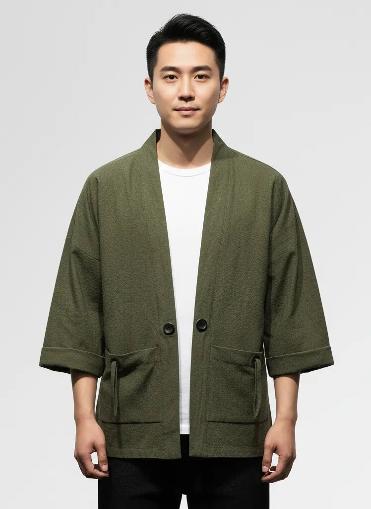 🌿 Style authentique et sobre : un haori kaki inspiré des vestes traditionnelles japonaises, revisité pour un usage quotidien.
