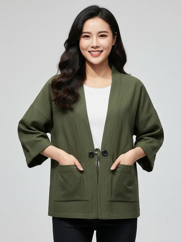 Ce haori ample kaki associe tradition et modernité avec sa coupe fluide et sa couleur inspirée de la nature. Facile à porter, il se marie aussi bien avec un jean qu’avec un pantalon ample, que ce soit pour une sortie en ville ou un moment de détente. Les poches pratiques et la fermeture à boutons ajoutent une touche fonctionnelle à son style minimaliste.