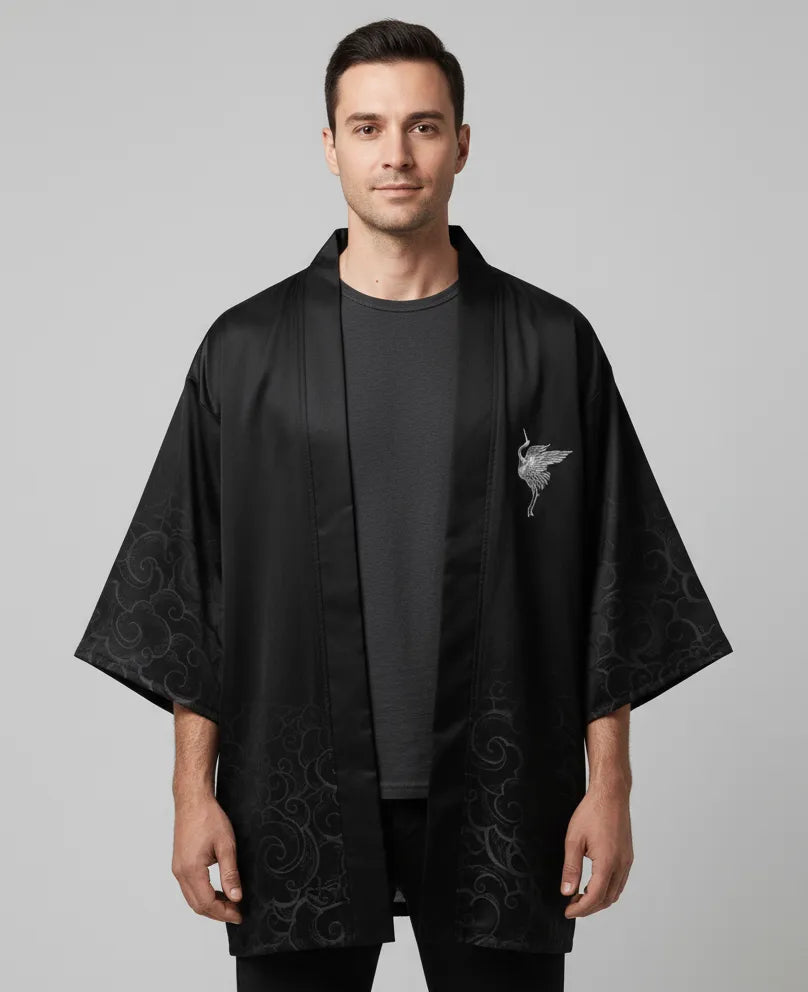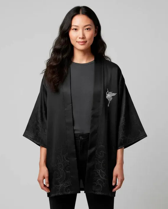 🕊️ Harmonie et légèreté : Ce haori noir met en valeur deux grues en mouvement, symbole de paix et de longévité dans la culture japonaise.