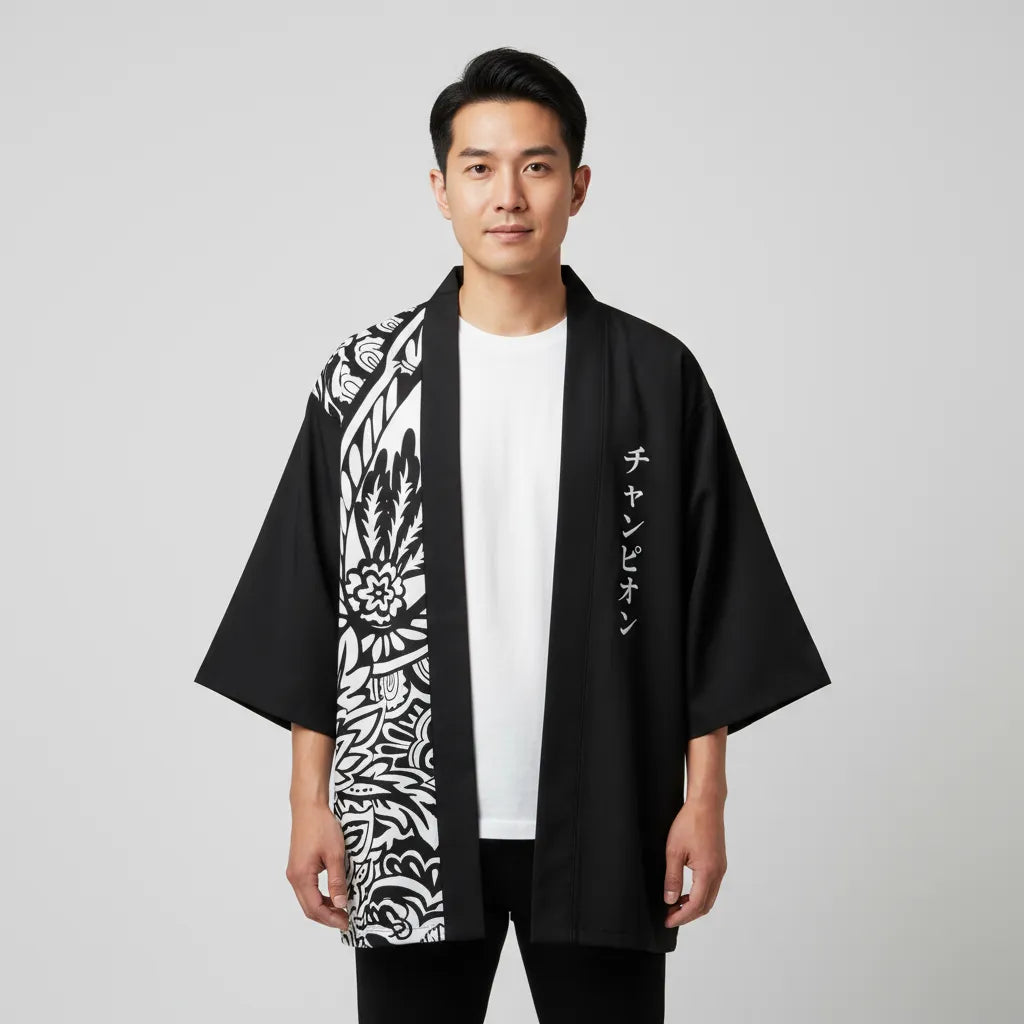 🖤 Haori unisexe : conçu pour femme et homme, cet haori noir incarne la fusion entre modernité urbaine et tradition japonaise. Son design bicolore audacieux — noir profond et motifs floraux blancs — offre une allure à la fois raffinée et affirmée.