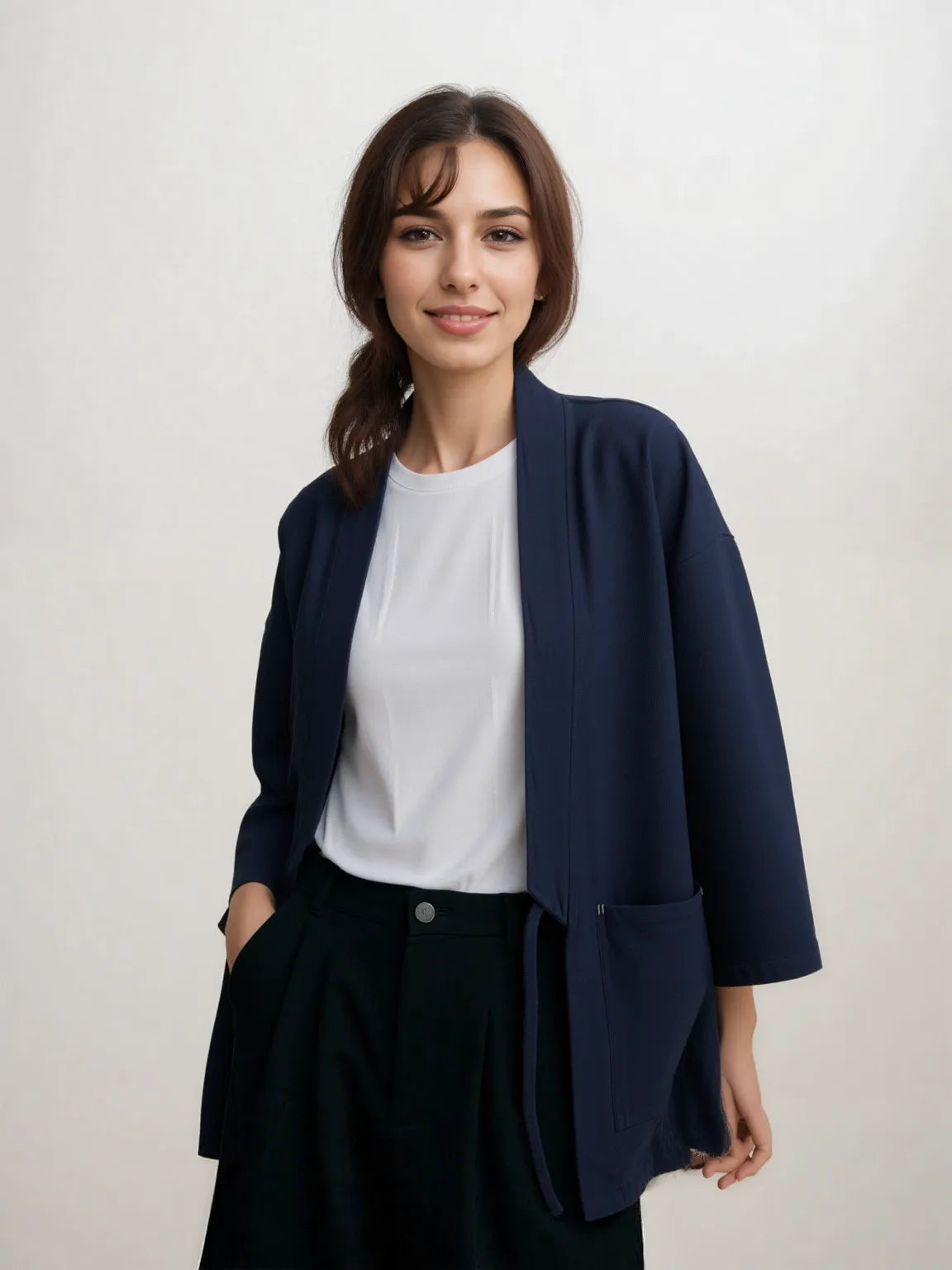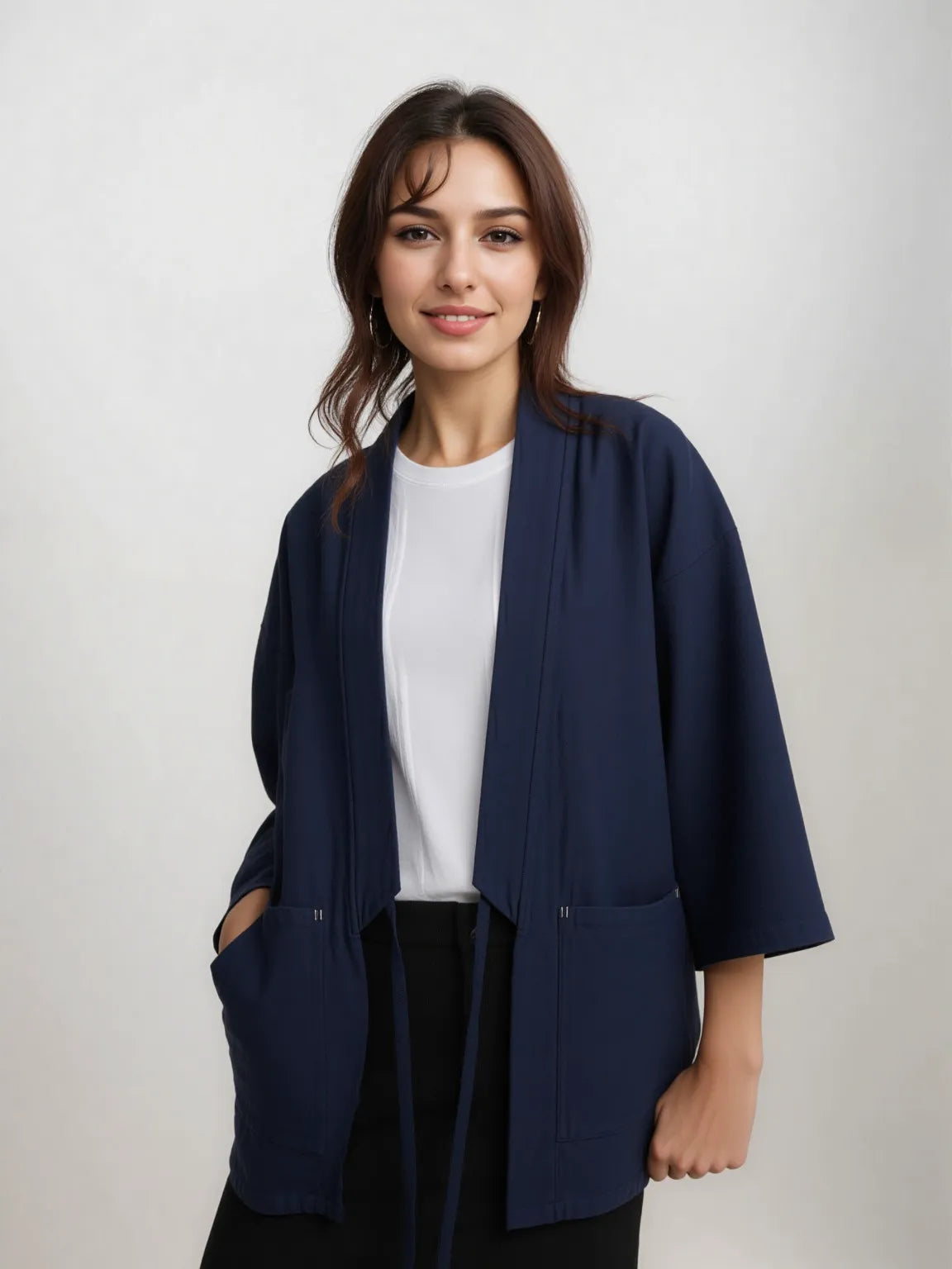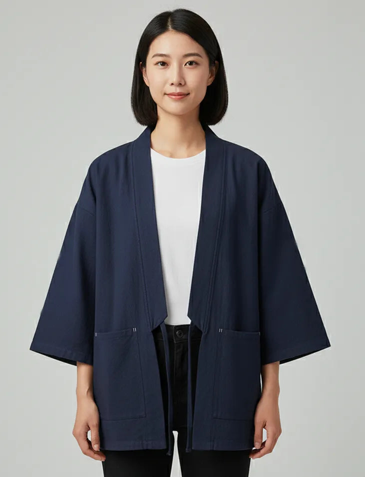 Ce haori bleu foncé séduit par son design minimaliste sans broderie, qui met en avant la pureté de la coupe japonaise. Léger et agréable à porter, il s’adapte à toutes les saisons et se combine aussi bien avec un jean qu’un pantalon ample. Sa fermeture par lien apporte une touche authentique tout en restant pratique au quotidien.