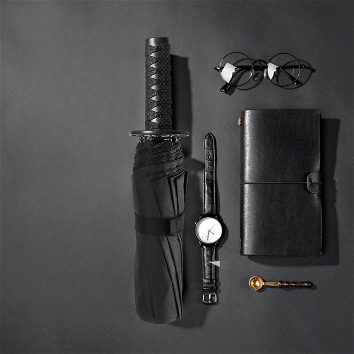 Ce parapluie réinvente l'accessoire de pluie en fusionnant esthétique samouraï et fonctionnalité moderne. Sa poignée sculptée reproduit fidèlement le tsuka d'un katana traditionnel, offrant une prise en main ergonomique et originale. Contrairement aux modèles longs encombrants, ce format pliable se transporte aisément dans les transports en commun ou au bureau.