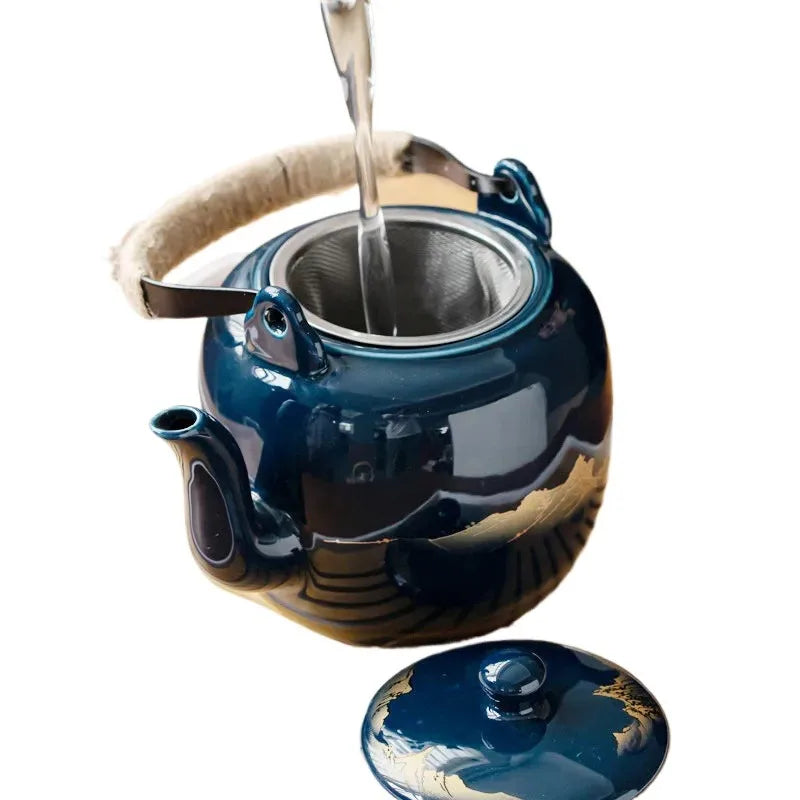 🍵 Théière émail noir profond infuseur, prépare feuilles vrac sans résidus tasses.