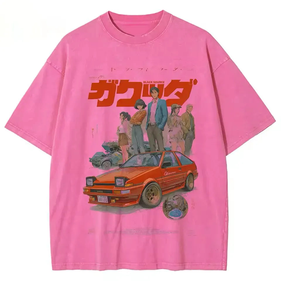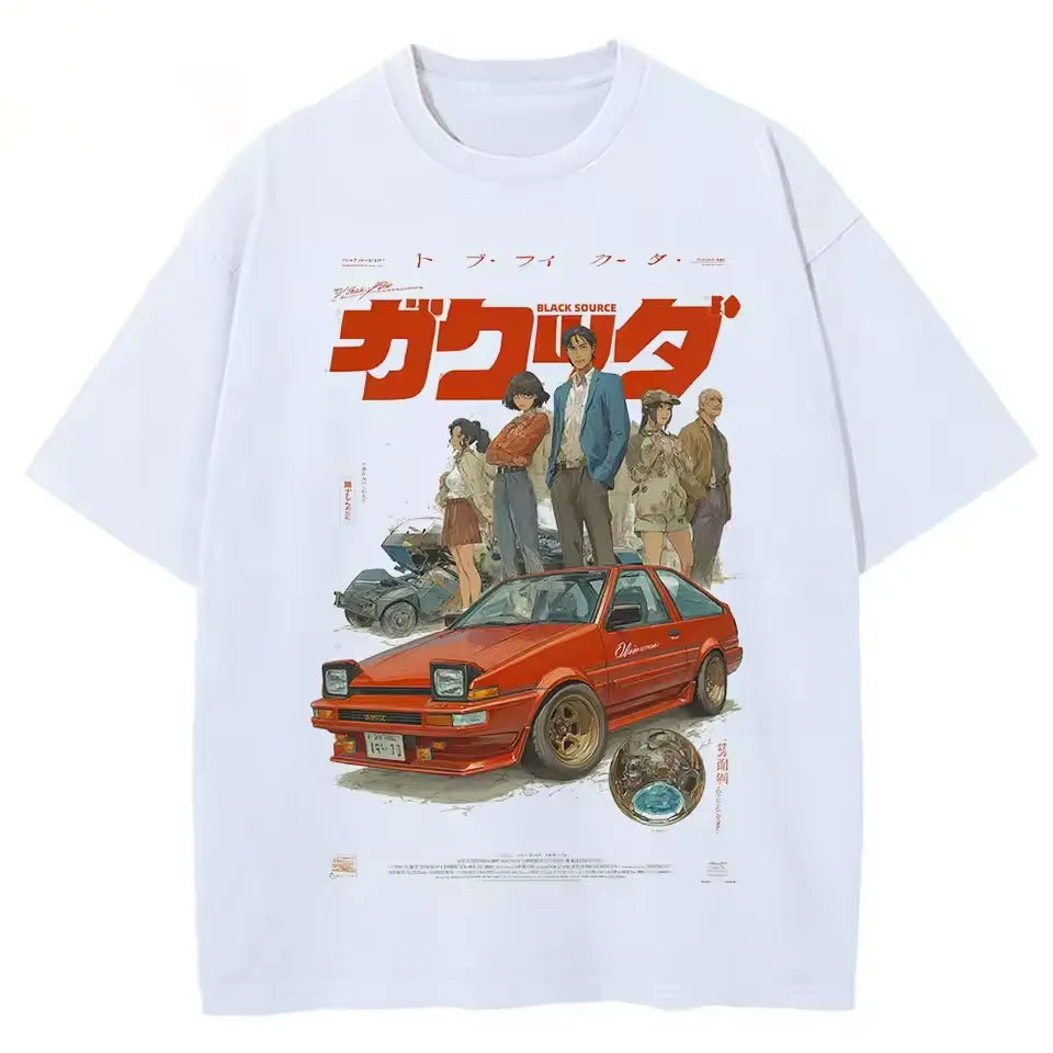 đ Design rĂ©tro japonais : ce t-shirt met en scĂšne un groupe de personnages dâanime vintage posant devant une Toyota AE86 rouge, symbole culte du drift japonais. Le visuel, accompagnĂ© dâinscriptions japonaises, Ă©voque les affiches dâanime et de films des annĂ©es 80-90.