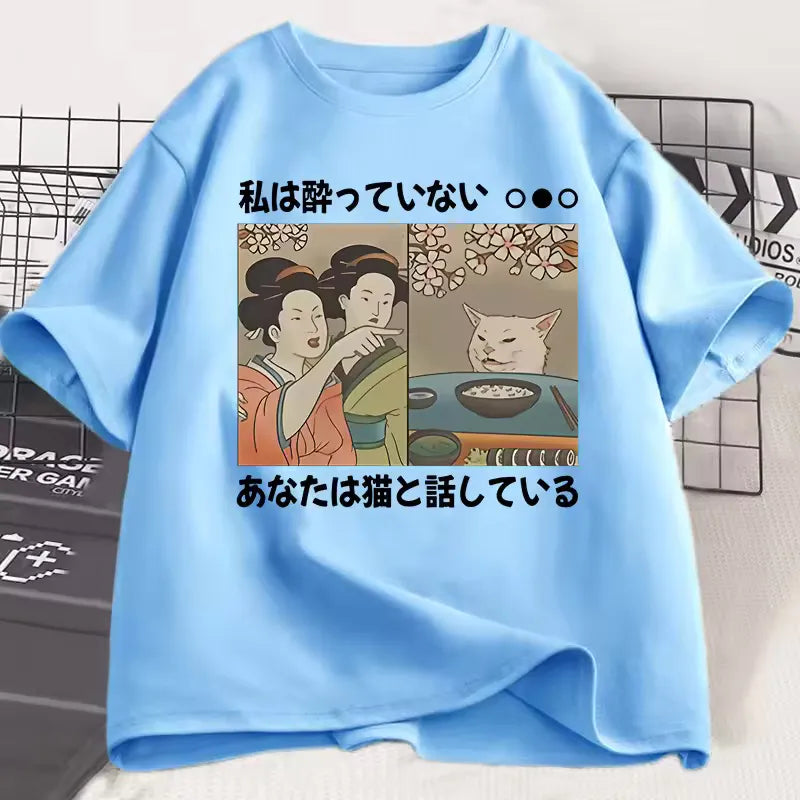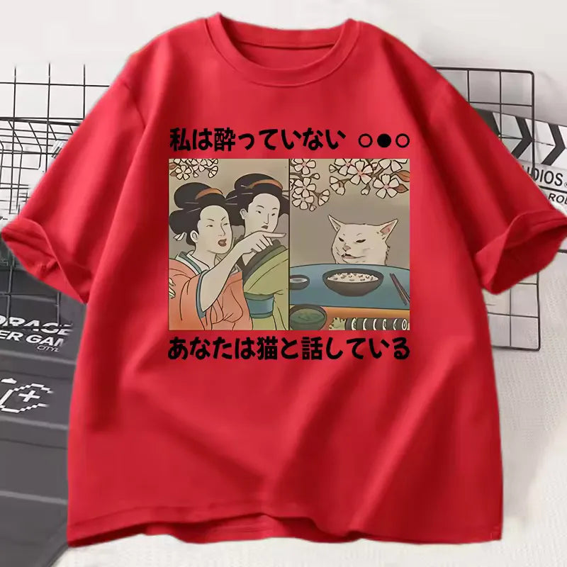 🎎 Ce t-shirt japonais humoristique revisite le célèbre mème “Woman Yelling at a Cat” dans un style inspiré des estampes Ukiyo-e. Deux femmes vêtues de kimonos traditionnels semblent argumenter face à un chat impassible devant un bol de riz, créant un contraste hilarant entre art classique et culture Internet moderne. Un must-have pour les amateurs de mode japonaise et de second degré.