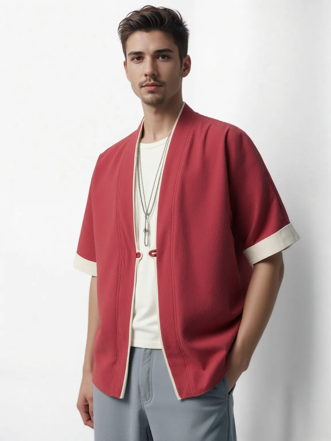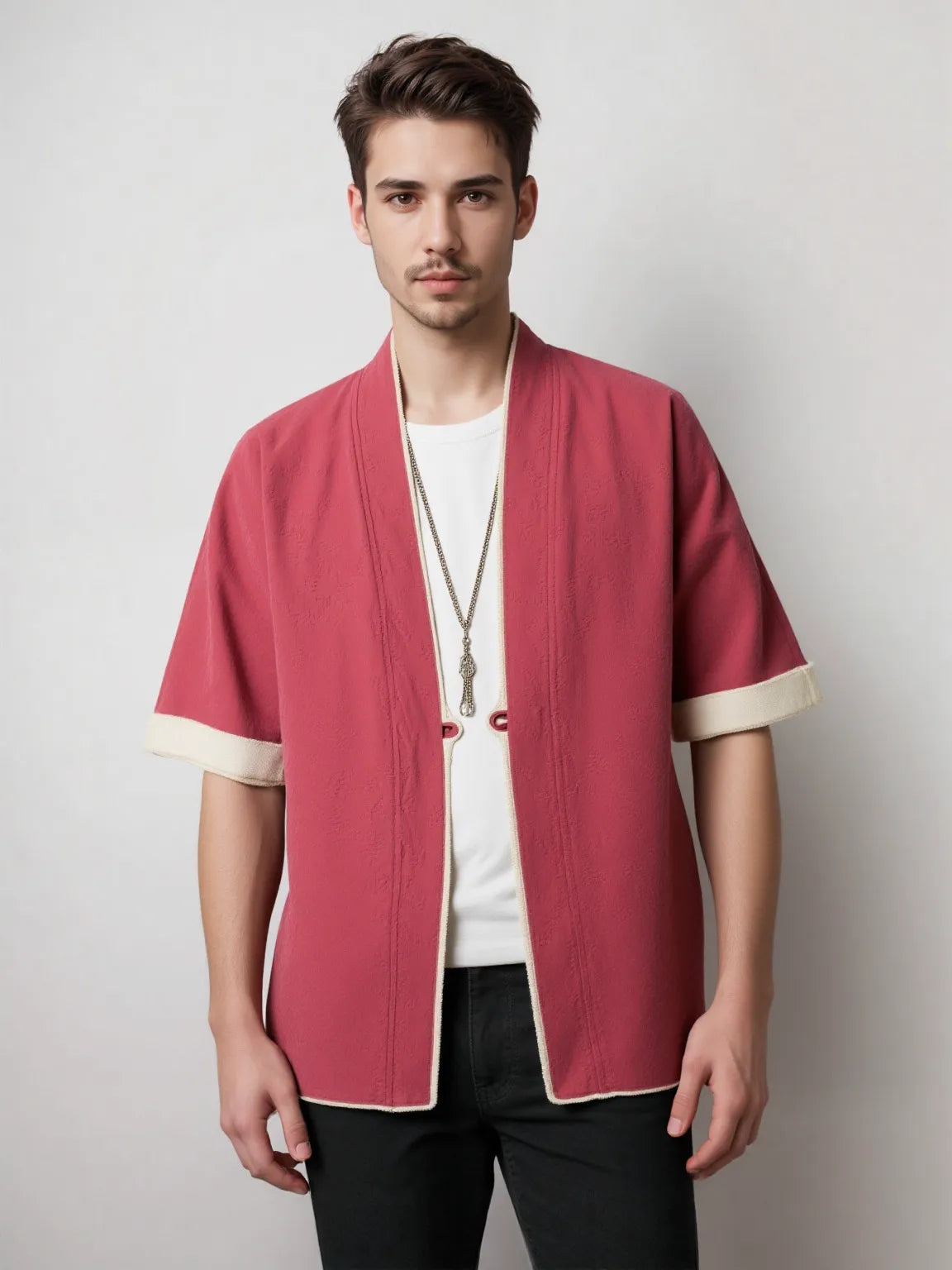 Cette veste kimono rouge apporte une touche audacieuse à votre style. Confectionnée en coton et lin, elle est légère, respirante et confortable en toute saison.