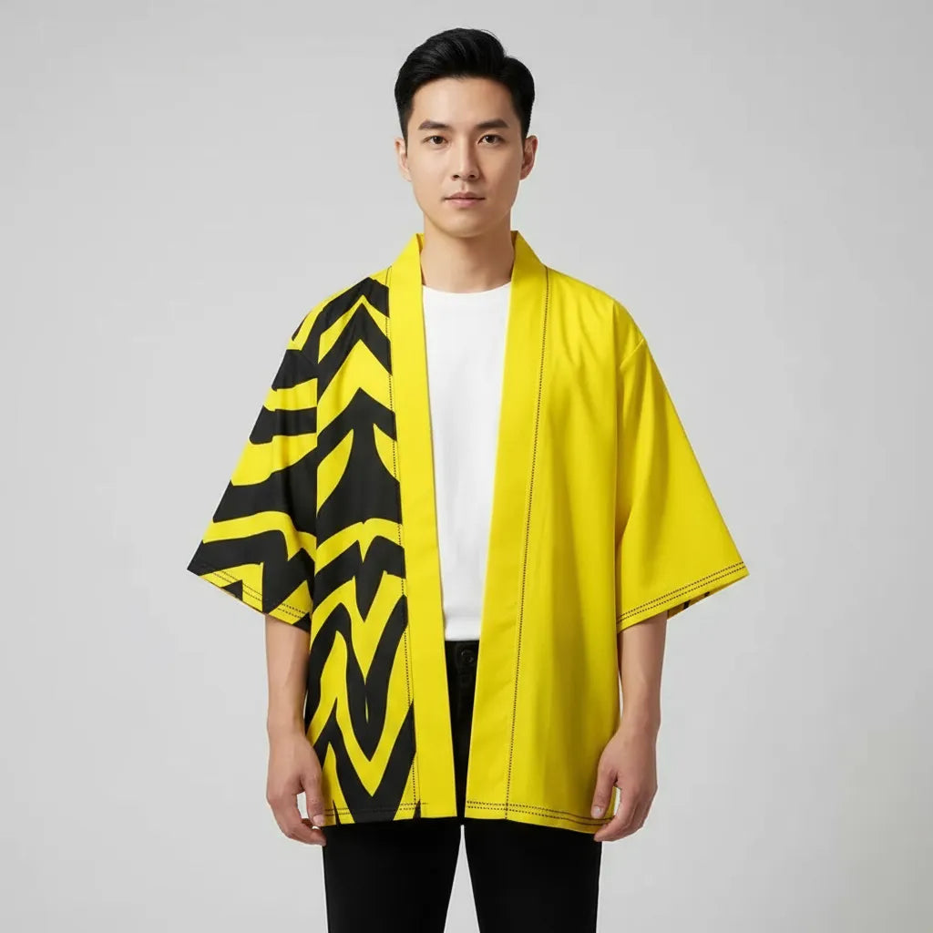 🟡 Veste kimono unisexe : inspirée du style japonais, cette pièce associe motifs rayés et couleur jaune lumineuse pour un look à la fois original et raffiné. Sa coupe fluide s’adapte aussi bien aux femmes qu’aux hommes.