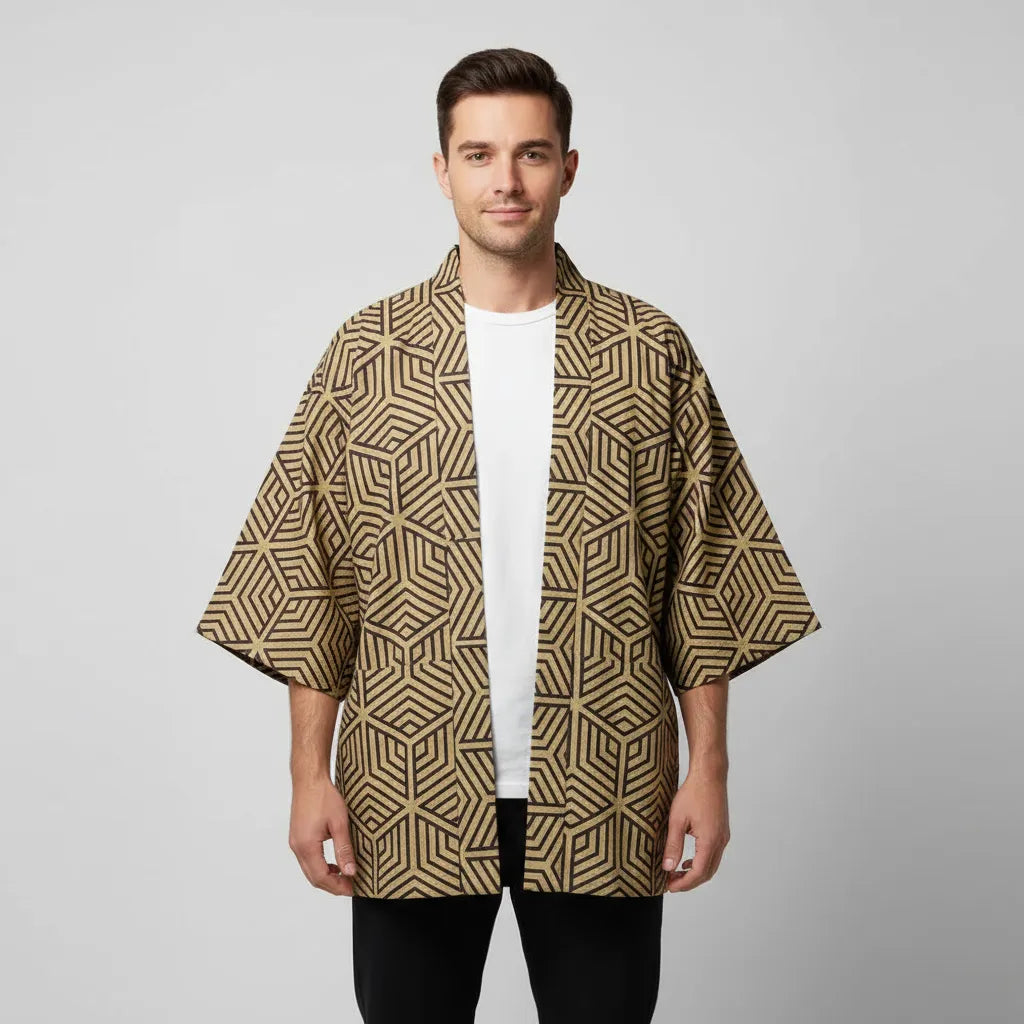 Veste kimono marron clair motifs géométriques