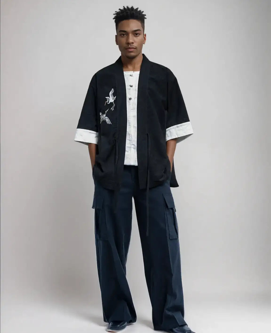 Cette veste kimono noir grue japonaise marie tradition et modernité. Confectionnée en coton, lin et polyester, elle est légère, durable et agréable à porter. Les grues brodées, symboles de bonheur et de longévité, apportent une touche élégante et culturelle à cette pièce unique.