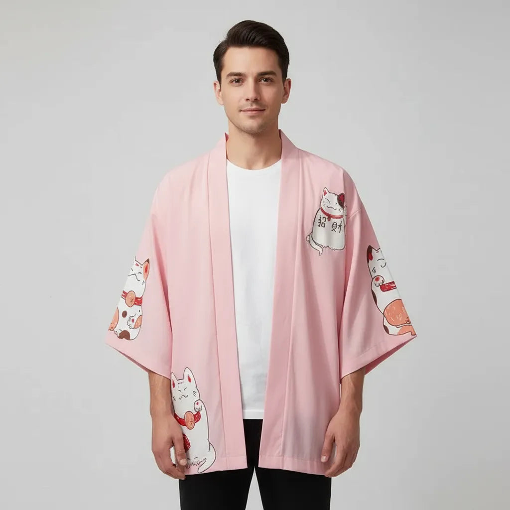 Veste kimono rose Maneki Neko : charme et chance japonaise