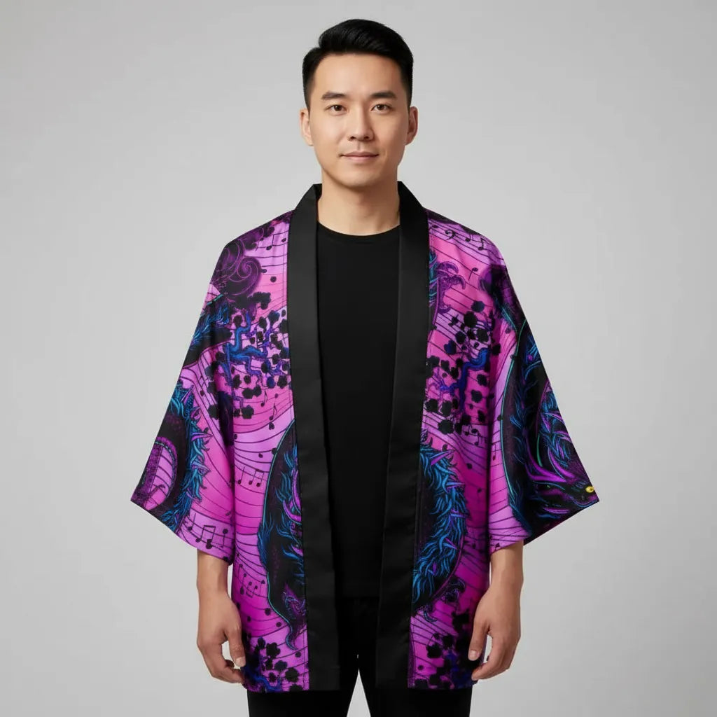 🐉 Veste kimono unisexe : inspirée du dragon japonais, symbole de puissance et de sagesse, cette pièce mêle tradition et modernité. Le motif majestueux du dragon bleu se déploie sur un fond violet profond, créant un contraste visuel fascinant.