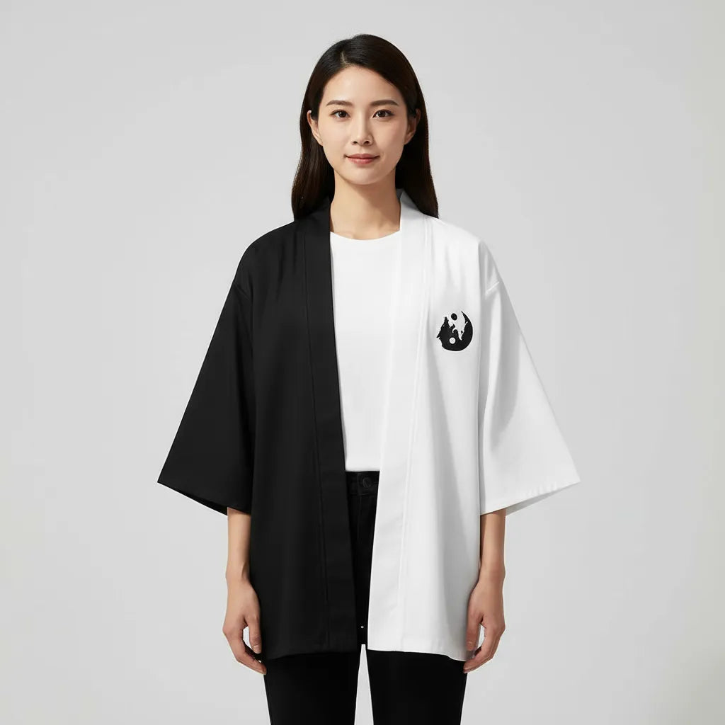 ⚪⚫ Symbole d’équilibre : cette veste kimono unisexe fusionne la philosophie du Yin & Yang avec l’élégance japonaise. Les teintes noir et blanc représentent l’union parfaite des contraires.